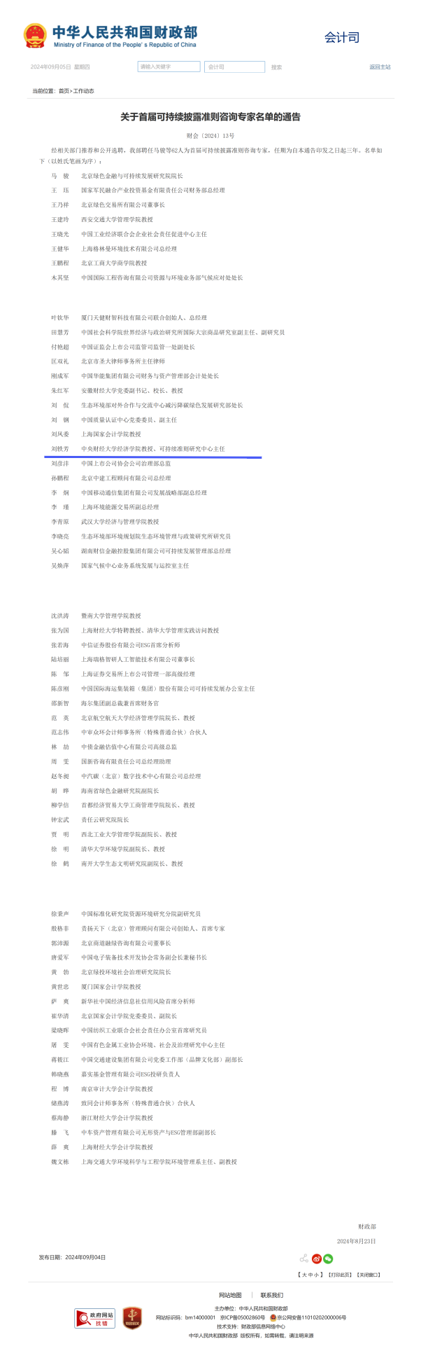 2024年9月4日,财政部公布了首届可持续披露准则咨询专家名单,经相关部门推荐和公开选聘,首届共聘任62名专家学者,任期为三年。bat365可持续准则研究中心主任刘轶芳教授,受聘为财政部首届可持续披露准则咨询专家。