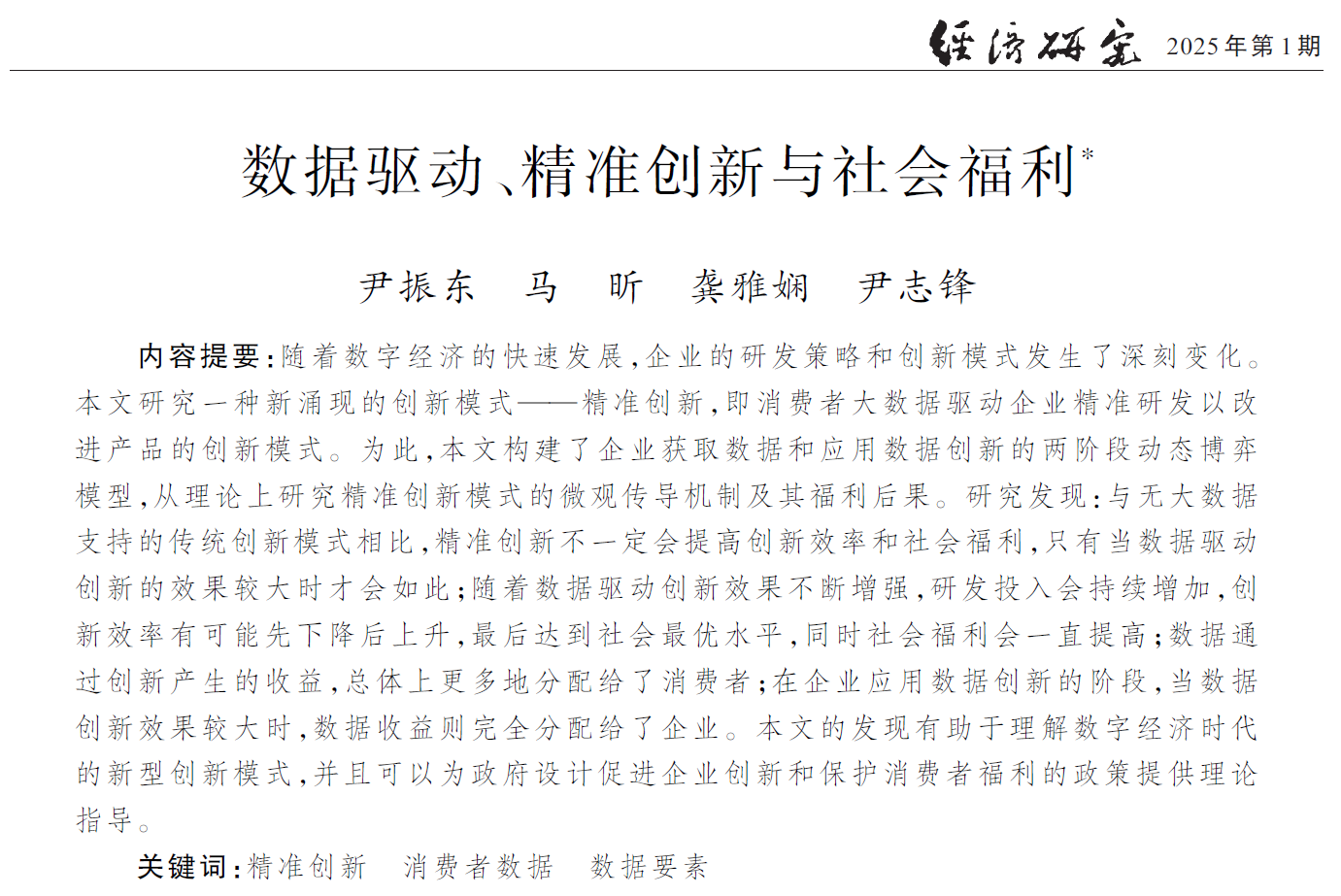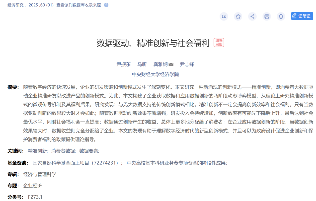 学术视点 | bat365老师的合作论文《数据驱动、精准创新与社会福利》在《经济研究》刊发