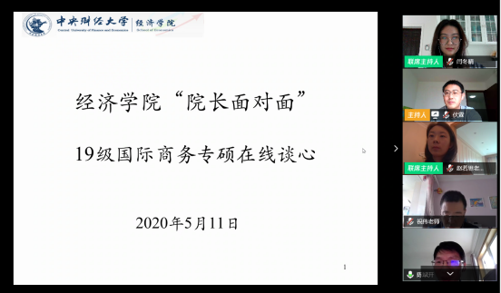 为深入了解国际商务专硕学生的想法和期待,进一步提升学院国际商务专硕的培养质量,院长陈斌开、副院长伏霖、副书记耿卉、组织员刘滨、国际经济系主任于爱芝、顾炜宇、祝伟、赵若思等8位专任教师和教辅老师于2020年5月11日下午,以在线会议的方式举行此次的“院长面对面”活动。陈斌开院长以及各位老师与bat365正版唯一官网19级国际商务专硕班的全体学生,围绕专硕同学就学习和生活方面的切身问题,进行深入的交流沟通。