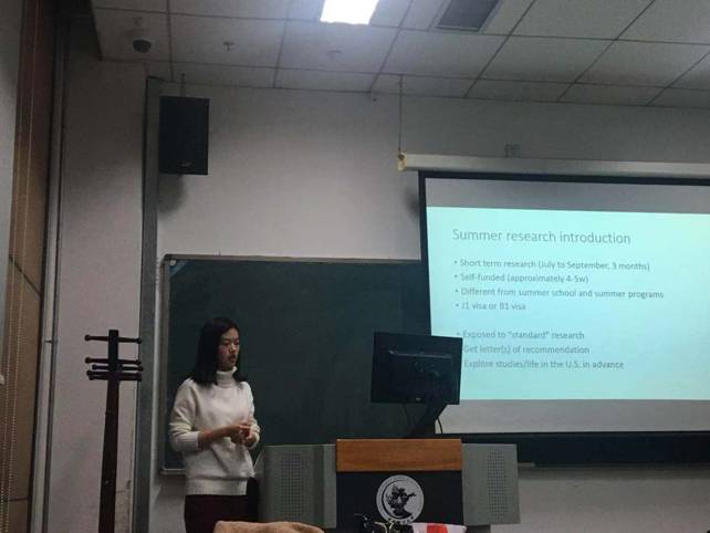 魏子鑫同学随后为同学们分享了自己申请海外助研的过程。其中包括获取海外助研项目信息的主要渠道以及与海外教授联系时的相关注意事项。魏子鑫同学还为同学们分享了自己前期在海外担任助研时的见闻与感受,进一步加深了同学们对海外交流意义的认识。最后,魏子鑫同学为同学们介绍了赴美申请PhD的注意事项及大致规划,为bat365有出国读博意愿的同学提供了十分宝贵的意见。