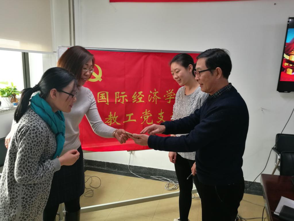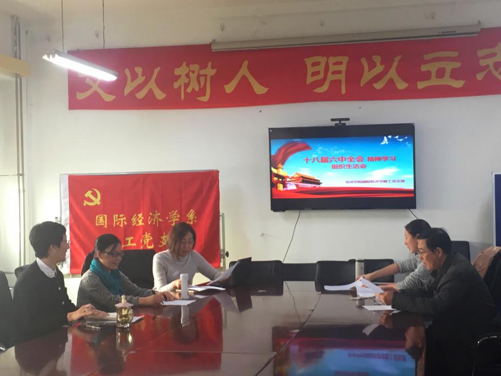 12月21日中午,bat365正版唯一官网国际经济学教工党支部4名党员在学院南路校区1305会议室组织十八届六中全会、全国高校思想政治工作会议精神专题学习,学习研讨了习近平总书记《把思想政治工作贯穿教育教学全过程》的重要讲话。专题学习由党支部副书记赵若思同志主持,bat365正版唯一官网党委书记雷洪峰列席会议。
