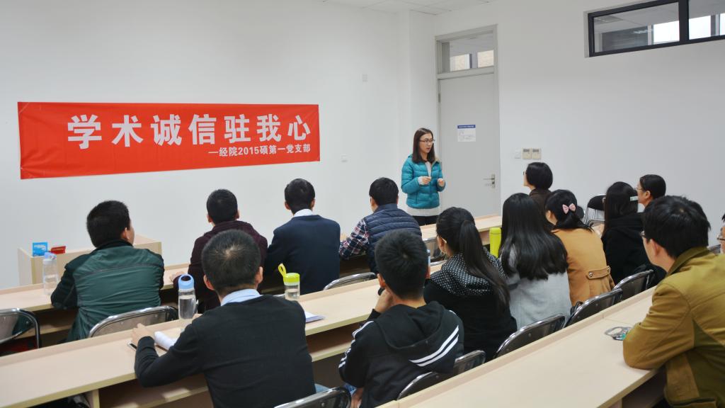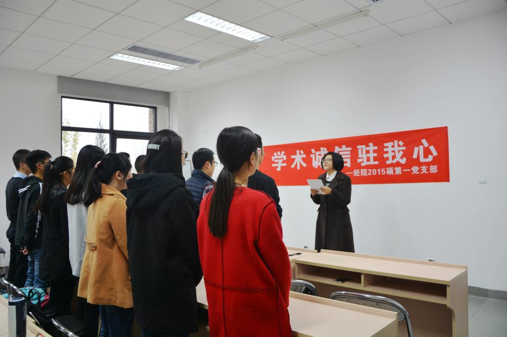 为铭记践行社会主义核心价值观—诚信,端正学术之风,bat365正版唯一官网2015硕第一党支部开展了“学术诚信驻我心主题教育活动”。活动在bat365正版唯一官网1号楼进行,bat365正版唯一官网的任老师为同学们做了学术诚信的讲座,任老师用生动的例子为我们讲述了诚信的价值内涵,剖析了学术诚信应遵守的原则,活动的参与者进行积极的发言,讨论对学术诚信的认知,最后集体进行了学术诚信宣誓,并且在横幅上签名留念,活动取得了良好的效果,学术诚信驻进每位同学之心,人人都争当诚信的代言人。