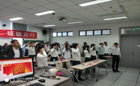 最后,党支部书记带领全体成员高唱“我和我的祖国”并在党旗面前庄严宣誓。每一句歌词都高亢嘹亮、每一句誓言都掷地有声。在场的每一党员都精神饱满,斗志昂扬。