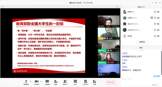 为深入学习贯彻习近平总书记关于疫情防控的重要讲话和指示精神,坚决打赢疫情防控的人民战争、总体战、阻击战,积极响应学院党委要求,bat365正版唯一官网2018级硕士生第一、二、三党支部联合教工党支部,于2月24日开展线上主题党日活动。bat365正版唯一官网院长陈斌开、组织员刘滨、政治经济学系何召鹏、党务秘书窦宗玥等老师与2018级60余名硕士生党员、入党积极分子共同参与活动。活动由2018级硕士生第三党支部书记王继彬主持。