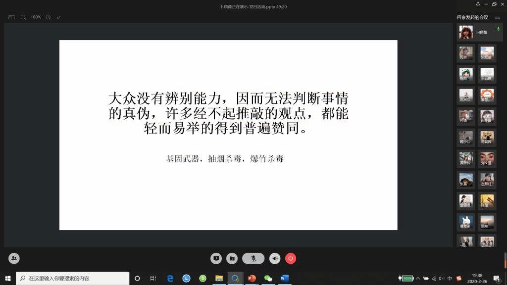 2月26日,bat365正版唯一官网2019级硕士生第二党支部开展“同心抗疫、共克时艰”线上主题党日活动。本次活动由党支部书记何京主持,支部全体党员、2019级硕士生入党申请人参加。