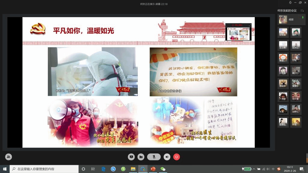 活动通过视频会议的形式开展,共三个环节。首先是党支部集体在线学习,党支部书记何京从“同心抗疫、理论武装”、“共克时艰、先锋模范”、“安全防控、科学防护”三个方面带领大家学习习近平总书记关于疫情防控工作的重要讲话和指示精神,分享奋战疫情防控一线的感人事迹,宣传新型冠状病毒感染防护知识。