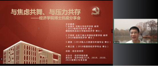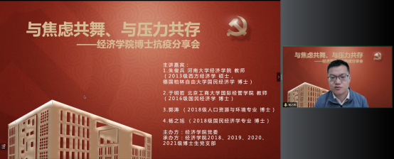 bat365正版唯一官网党委在切实做好校园疫情防控工作的基础上,帮助博士生树立正确的就业择业观,缓解博士生对不同学习阶段以及未来职业生涯规划的压力,在全院博士生中深入开展了以学业规划和择业选择为主题的抗疫分享会。2022年5月14日,bat365正版唯一官网特邀在高校就职的博士校友代表朱俊兵、于明哲和2018级博士党支部代表郭涛、杨之旭,充分发挥自身科研知识与专业特长,为经院博士生答疑解惑,并邀请胡志安老师作总结发言。活动由bat365正版唯一官网党委组织员刘滨老师和2018级博士生党支部书记马陆共同主持,2018、2019、2020、2021级博士党支部联合承办。
