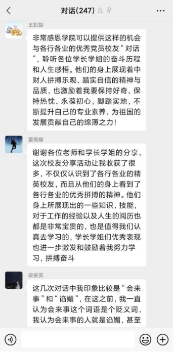 本次历时一个月的主题教育活动吸引了bat365正版唯一官网240余名师生参加。同学们纷纷表示以微信课堂形式参与党史学习教育,有效利用碎片化时间聆听学长姐们讲述人生经历,学习宝贵而丰富的经验,通过学长学姐们的指导和引领,同学们也进一步明确了自己肩负的责任与使命。