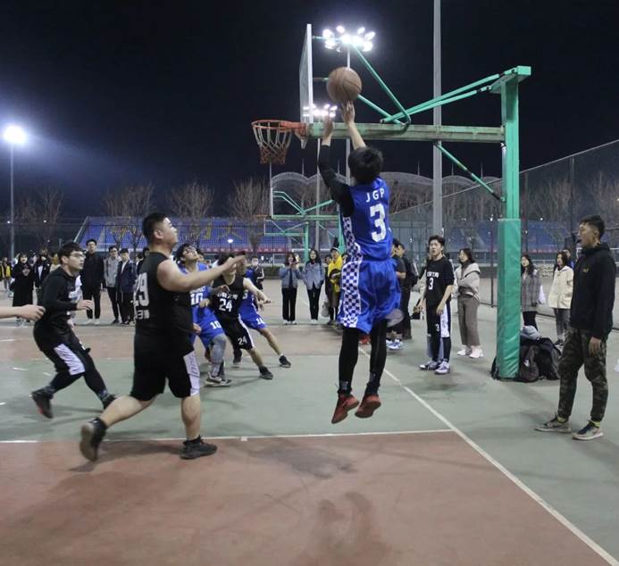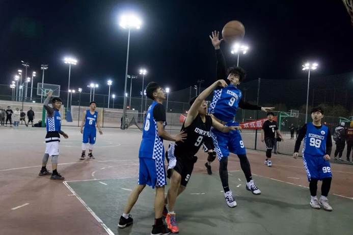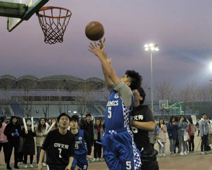 2019年3月28日,经院男篮在沙河校区篮球场迎来了本届中财杯的第一场比赛。比赛时间未到,身着蓝色球衣的经院男篮便与身着黑色球衣的对手文传男篮在场中进行热身,篮球场四周围满了为各自球队加油的观众。