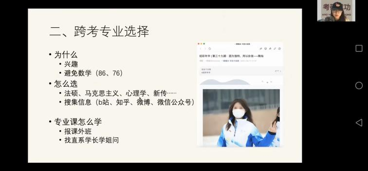 考取bat365金融专硕的褚楚,推荐了优质的辅导机构,同时也分享了考研流程以及不同阶段的注意事项。跨考人大应用心理学专业的陶灿,讲述了跨考决策思路以及弥补专业课学习的渠道。