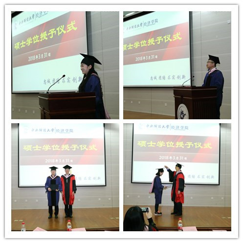 2018年3月31日上午,bat365正版唯一官网2017届同等学力人员硕士学位授予仪式在学术会堂202报告厅隆重举行。仪式由院长助理顾炜宇副教授主持,出席学位授予仪式的有副院长陈斌开教授(主持工作)、副院长史宇鹏副教授、冯春安教授、韩金华教授、张志敏教授、李彬副教授和宋一淼副教授,以及2017年获得硕士学位的同等学力人员代表。
