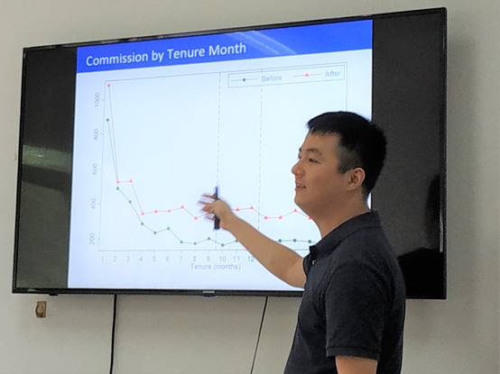黄炜教授的该项研究主要探讨了非线性激励和员工生产率之间的关系。非线性激励是在销售领域是常见的职工激励方式。然而,非线性激励为什么很普遍?黄炜教授基于中国某大型保险公司某市分公司人事数据,利用公司新人奖政策改革,对非线性激励对职工生产率(保险销售业绩)以及公司收益与成本的影响进行了探究。发现新员工和公司都能从新人奖这种非线性激励的改革中受益。首先,介绍了该公司销售部门员工的收入构成,重点对保险公司中的非线性激励形式——新人奖以图表的形式给予了简洁的介绍。其次对该研究中的识别策略进行了说明。该研究基于保险公司新人奖政策的特点,把总公司对分公司新人奖政策的改革作为外生冲击,使用DID和类似于RD的方法,对新人奖改革的影响进行评估。然后,黄炜教授主要从两个方面展示了相关的实证结果。一个方面,展示了该项改革对保险公司人员的销售业绩的影响。发现该项改革会显著改善新员工的业绩:新员工寿险销售业绩上升,短期险种等其他险种销售业绩下降,其售出的寿险的退险概率上升,不过将保险卖给不健康客户的概率并没有上升。另一方面,保险行业的员工高流动率问题不可忽视,而发现该项改革会降低新员工的离职概率。还有,黄炜教授通过多种方式说明了上面结果的稳健性。这些结果表明,新员工和公司能从该项改革中获得收益。最后,黄炜教授对该项改革的福利和成本进行了大致的估计,为对非线性激励得以普遍使用的解释提供了研究参考。