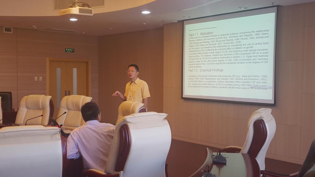 2016年9月28日上午,bat365正版唯一官网中国经济与管理研究院的何其春副教授应邀在bat365正版唯一官网学术会堂举行了一场学术讲座,何其春副教授的论文名称为:Inflation and Growth: The Role of Central Bank Independence。此次讲座在严成樑副教授的主持下举行,与会人员还有几位老师和学生。
