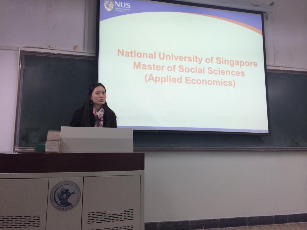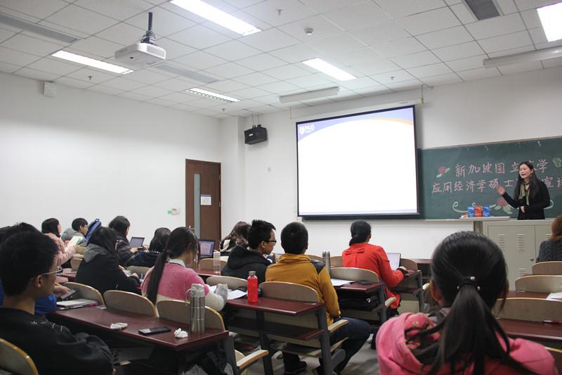 宣讲会上,韦青老师首先向同学们介绍了新加坡的风土人情、区位条件。与欧美相比,新加坡无疑是更具亲和力的留学地点。随后,韦老师谈到了新加坡的高校建设情况。新加坡国立大学共由16个学院组成,应用经济学硕士项目隶属于人文与社会科学学院的经济系。作为新加坡高级人才的培养中心,NUS每年获得政府经费2.5亿新元,在政府的大力支持下,新加坡国立大学迅速发展。之后韦青老师从项目方向、课程设置、录取条件、留学费用、毕业去向等方面对应用经济学硕士项目做了详细的说明。国大经济系的应用经济学项目已有20多年的历史,目前班级公邮77名来自新加坡、中国、印度及世界各地的学生。该项目以应用经济学为主,主要课程涉及微观经济学、宏观经济学、计量经济学、金融学等经济、金融相关领域,学生可以在读书的同时去企业进行充分的自我完善和锻炼,本项目的毕业生分布在新加坡国内外的银行、金融服务、科研教学、投资咨询等行业,为新加坡经济发展做出卓越贡献。
