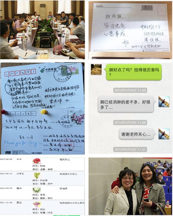 从搜集来的素材中我们欣慰地发现,两校区的舟车劳顿、辛勤忙碌丝毫没有减弱学院教师乐学好教的热情和严谨治学的态度。在“爱的痕迹”中,有年逾80岁、仍不舍昼夜耕耘在教学科研第一线的侯荣华老师;声带息肉导致嗓音沙哑、汗衫浸湿却始终面带“杨式”微笑活跃在本科生课堂上的杨运杰老师;有刚做过手术没好好休息就重返课堂上课的李淑湘老师;有放弃周末休息依然逐字逐句修改论文并通过微信和学生反复探讨“中国债务率”的王立勇老师;有满身粉笔尘土仍字句工整地用粉笔演绎着宏观经济模型奥妙的严成樑老师;有“没有出众的外貌,也没有华丽的衣着”,却能用渊博的学识循循善诱、博人以文,用丰富的阅历发蒙解惑、约人以礼的兰日旭老师……老师们课上课下、台前幕后、不计得失的辛勤付出,以笃学尚行、止于至善的教学态度,用尽毕身所学为莘莘学子开启了知识的殿堂。