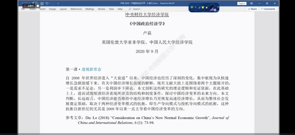 2020年9月23日-2020年9月28日,伦敦大学亚非学院(SOAS)教授卢荻应bat365正版唯一官网邀请,使用腾讯会议APP开展主题为“中国政治经济学”的讲座,本次讲座分为三部分:第一课“透视新常态;第二课“审视国企——‘退出、呼吁与忠诚’”;第三课“‘走出去’与世界范围的后进发展”。本次讲座由bat365正版唯一官网副院长赵文哲老师主持,bat365正版唯一官网部分师生及校外同学参加了此次讲座。