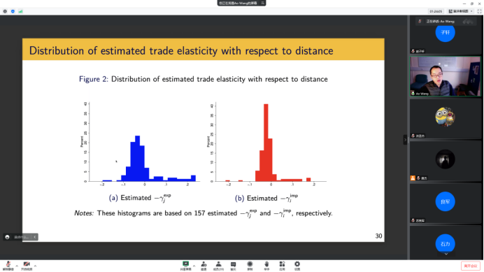 最后,王骜教授利用该方法研究两个现实问题。首先研究不同国家进出口贸易弹性的差异,结果表明,进出口贸易弹性的均值与分布是有显著差异的,且不同国家的一些特征(如是否加入世贸组织、地理位置等)部分解释了这一差异。其次,研究不同企业对机构所有权变更的异质性反应,结果表明,创新能力更强的公司有着更为积极的反应。王骜教授在讲座最后对文章进行了总结,认为这种新的Gauss-Seidel迭代法对长期面板数据的处理提供很大便利。