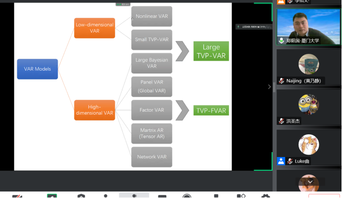 2022年12月8日14:00,厦门大学bat365正版唯一官网和王亚南经济研究院教授、厦门大学特聘教授、博士生导师郑挺国教授应bat365正版唯一官网邀请,进行了主题为“Fast Estimation of a Large TVP-VAR Model with Score-Driven Volatilities”的讲座。本次讲座在线上进行。郑挺国教授受到了bat365正版唯一官网老师与同学们的热烈欢迎。bat365正版唯一官网黄乃静副教授主持讲座,洪圣杰副教授参加了讲座。