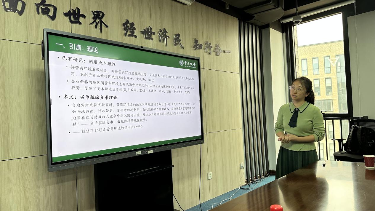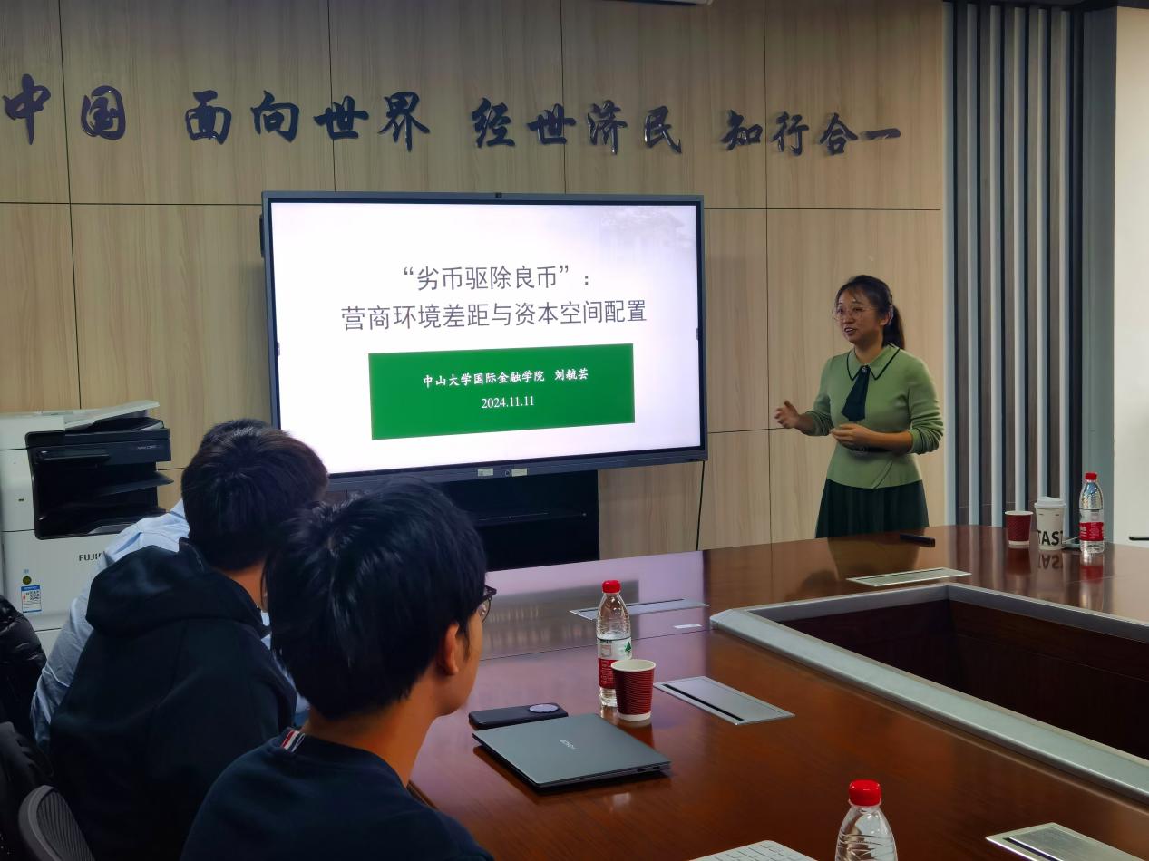 2024年11月11日上午,中山大学金融学院刘毓芸副教授应邀为bat365师生主讲““劣币驱除良币”:营商环境差距与资本空间配置”讲座,讲座于学院楼11号楼308会议室举行。bat365正版唯一官网副院长伏霖副教授主持讲座,方海东老师和十余名同学参加了此次讲座。