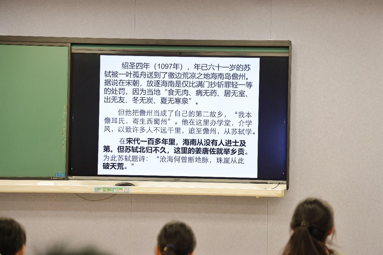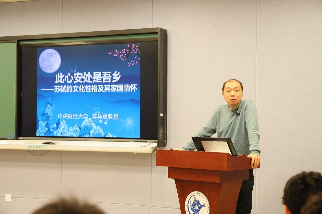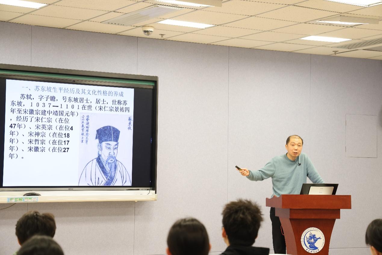 讲座伊始,莫林虎教授沿着苏轼的人生轨迹,生动地描绘出其从科举成名到仕途波折的历程。苏轼年少便在“春秋对义”中拔得头筹,尽显非凡才情,然“乌台诗案”却使其命运急转直下,屡遭贬谪。但他于黄州、惠州、儋州的逆境之中,始终怀着对国家的忠诚与经世济民的抱负。“问吾平生功业,黄州惠州儋州”,这自嘲背后是他在困境中坚守初心的伟大,令在场同学无不为之动容,深刻领悟到坚韧不拔的精神力量。