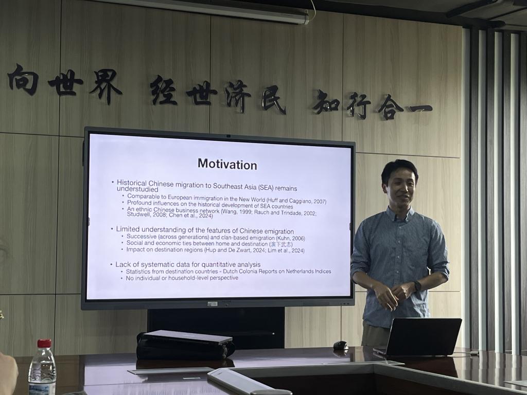 5月16日周五下午,bat365正版唯一官网“中青年学者讲座”于沙河校区学院楼11号楼308会议室举行。此次讲座邀请到暨南大学bat365正版唯一官网陈方豪助理教授,分享题为“Exploring the Dynamics of Chinese Emigration through Transnational Genealogical Lens”的研究。bat365正版唯一官网胡志安副教授主持讲座,bat365正版唯一官网多位老师和十余名学生参加了此次讲座。