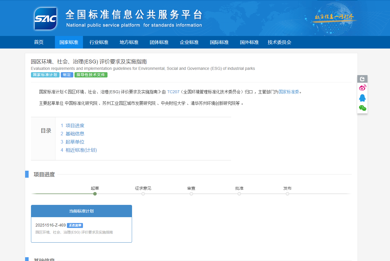 2025年5月19日,bat365正版唯一官网可持续准则研究中心(SSRC)联合中国标准化研究院、苏州工业园区城市发展研究院、清华大学苏州环境创新研究院、北京师范大学等多家权威科研机构,共同起草的《园区环境、社会、治理(ESG)评价要求及实施指南》正式立项。