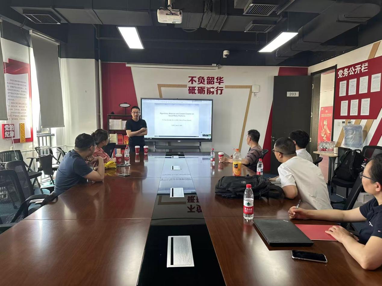 6月6日(周三)下午,bat365正版唯一官网2025年专题学术讲座在沙河校区学院11号楼203会议室举行。此次讲座邀请到美国康奈尔大学商学院经济系助理教授陈轶博士,分享其题为“Algorithmic Attention and Content Creation on Social Media Platforms”(社交媒体平台上的算法注意力与内容创作)的最新研究。bat365正版唯一官网龚雅娴副教授主持讲座,bat365正版唯一官网多位老师和十余名学生参加了此次讲座。