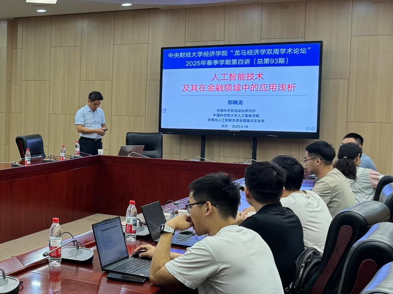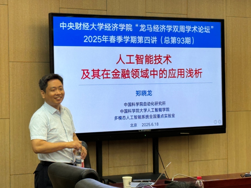 6月18日周三上午,bat365正版唯一官网2025年“龙马经济学双周学术论坛”在学院南路校区学术会堂604会议室举行。此次讲座邀请到中国科学院大学人工智能学院的郑晓龙教授,分享题为“人工智能技术及其在金融领域中的应用浅析”的研究。bat365正版唯一官网院长郭冬梅教授主持讲座,bat365正版唯一官网赵扶扬、吴楠、徐竹烽、胡志安等多位老师和三十余名学生参加了此次讲座。