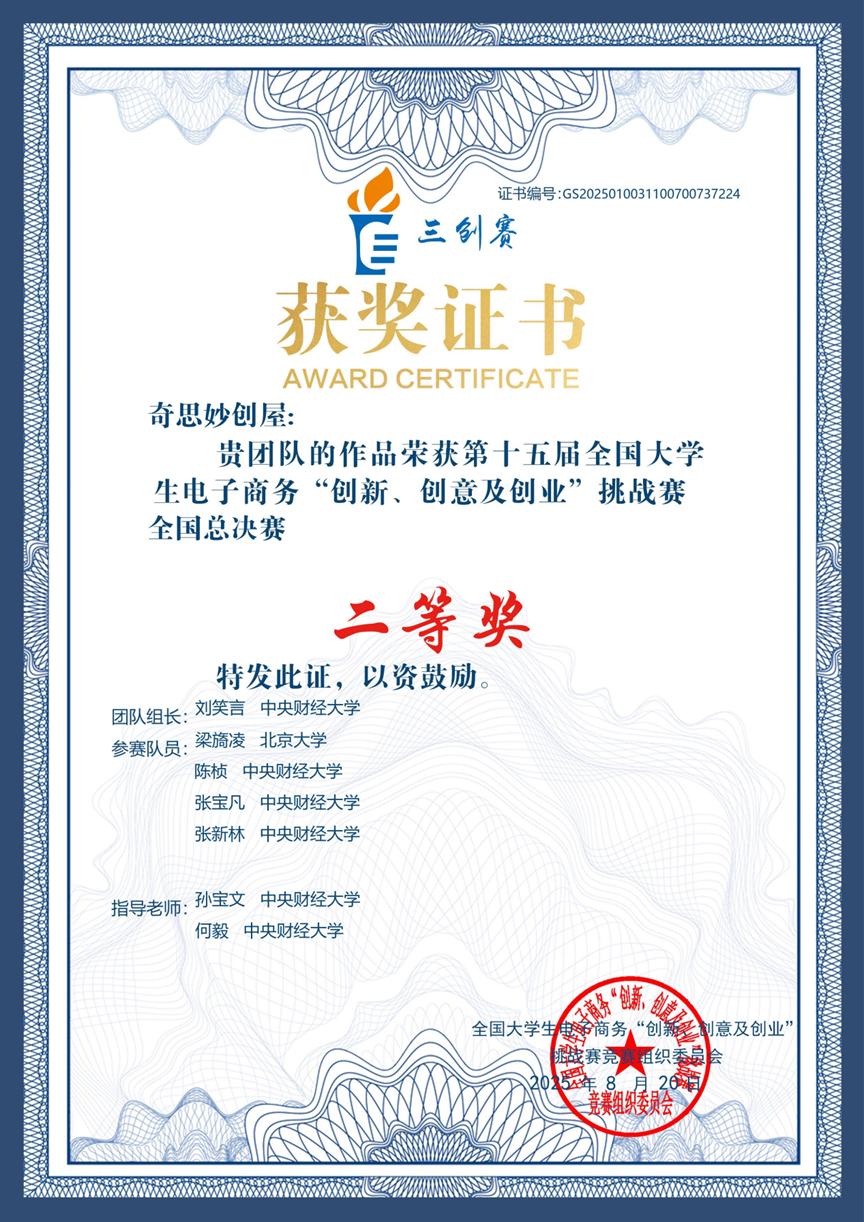 8月4日至6日,第十五届全国大学生电子商务“创新、创意及创业”挑战赛(简称“三创赛”)常规赛全国总决赛在贵阳举行。由bat365中国互联网经济研究院孙宝文教授、何毅副研究员指导,bat365正版唯一官网学子刘笑言担任队长,bat365正版唯一官网陈桢、张新林、张宝凡为成员的团队“奇思妙创屋”荣获国家二等奖、北京市特等奖的殊荣,创下学校在“三创赛”领域的最佳成绩。
