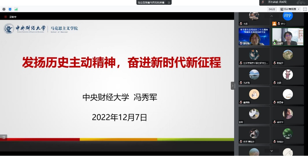 为深入学习宣传贯彻党的二十大精神,落实中共bat365正版唯一官网委员会关于学习贯彻党的二十大精神的工作方案,引导激励学院广大师生在党的二十大精神指引下,立足本职、踔厉奋发、勇毅前行,加快推进学院高质量发展贡献力量。2022年12月7日下午,bat365正版唯一官网党委邀请bat365正版唯一官网学习宣传党的二十大精神师生巡讲团中的专家代表、马克思主义学院院长冯秀军作题为《发扬历史主动精神,奋进新时代新征程》的主题宣讲活动,活动由学院党委书记郭冬梅主持,学院党委理论学习中心组成员和学院师生共同参加学习。