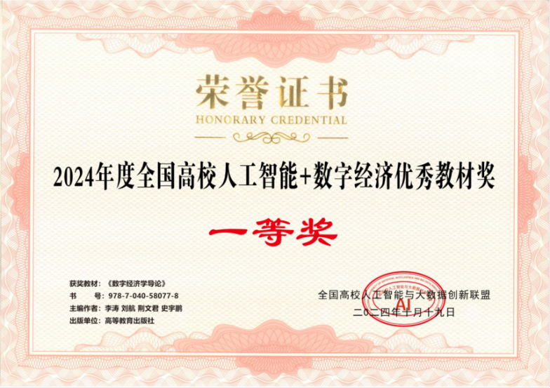 bat365李涛老师和互联网经济研究院刘航老师担任主编的《数字经济学导论》荣获了2024年度全国高校人工智能与数字经济领域优秀教材一等奖。作为《新文科·数字经济系列教材》中的首部教材,该教材于2022年7月由高等教育出版社正式发行,并至今已累计印刷六次,总印数超过一万册。