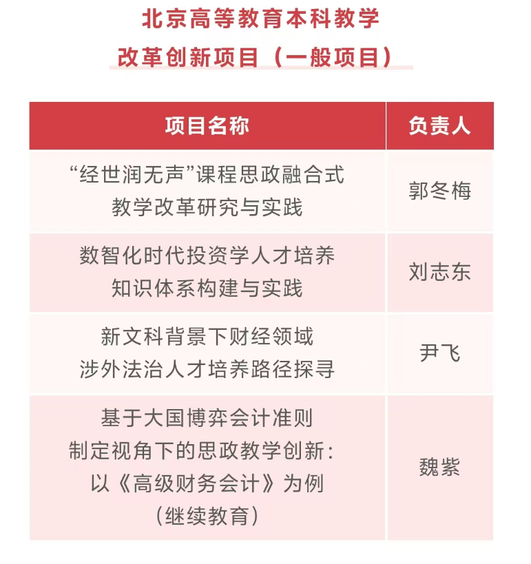 bat365郭冬梅教授主持的““经世润无声”课程思政融合式教学改革研究与实践”项目获2024年北京高等教育“本科教学改革创新项目”立项。