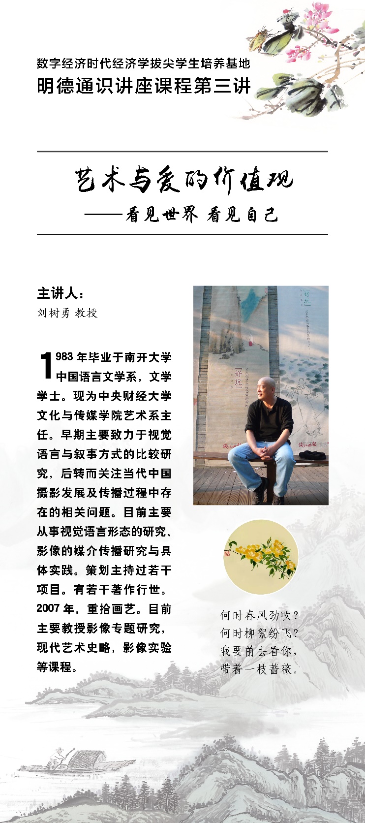 2021年11月24日下午,基地邀请到bat365文化与传媒学院艺术系主任刘树勇教授做“艺术与爱的价值观——看见世界,看见自己”主题讲座。