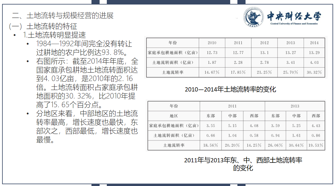 随后,李研同学介绍了本书的九、十两章。第九章——农村土地承包经营权流转和市场发首先回顾历史,梳理了农村土地承包经营权流转的政策演进和2002年土地承包法实施以来的土地流转状况。全国农村土地流转的比例约为10%。土地流转形式在地区之间和个案之间呈现很大差异,主要有返租倒包、转包、租赁、土地入股四种形式。然后,作者指出当前土地流转的现状以及土地流转与规模经营的几个政策问题:落实农民土地承包经营权长久不变,是保证土地流转的制度前提;完善农民土地承包经营权权能,切实保护土地流转中承包农户的主体地位;正确对待规模经营和公司进入农业;建立土地承包经营权流转市场,促进土地承包经营权规范流转。第十章——中国农村土地权属及其经营方式的变化分为两个部分:农村土地权属状况与变化和土地流转与规模经营的进展。本章首先简要回顾了我国目前农村土地的状况与土地流转的特征,并指出,从流转主体来看,农户仍是土地转入的主体,但接包主体趋于多元化,从农户单一主体向农民专业合作社与企业等多主体转变。但在流转比例和速度加快的同时,也存在一些问题:部分土地流转后“非粮化”;土地经营规模不是越大越好,大规模经营户面临地租快速上涨、雇工费用高、请工难的问题。