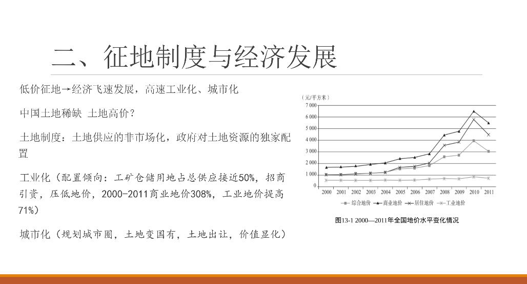 花野同学介绍了书中第十一章和第十二章的内容,主要回顾了中国土地管理制度的历史演变及其面临的挑战。第十一章详细分析了中国土地管理制度的历史演进。1949年土地公有制确立以来,中国土地制度经历了多次变革:从1953年至1977年的农业合作化和人民公社化,到1978年后的农村土地承包责任制,再到1998年后城市土地市场化的推进。每个阶段的制度变迁都反映了特定历史背景下的经济和政治需求。然而,这些变革也带来了土地资源分配不均、效率低下等问题,尤其在城乡之间,土地管理制度仍存在明显的二元结构问题。第十二章进一步探讨了这种二元土地权利制度及其导致的市场缺陷。在中国,城市土地实行国家所有制和市场化管理,而农村土地仍为集体所有,土地交易相对受限。这种结构导致农村土地面临产权残缺,资源难以得到有效利用和流转,城乡土地市场发展不平衡。这也引起我们反思,未来的土地制度改革应进一步推动城乡土地市场的协调发展,完善农村土地流转机制,加强法律保障,以确保土地资源的合理配置。同时,改革应避免过度依赖土地财政,减少资源浪费,推动土地的可持续利用。书中这一部分为进一步理解中国土地制度的历史演进和现状挑战提供了新的视角,也为未来的改革方向提出了有价值的建议。