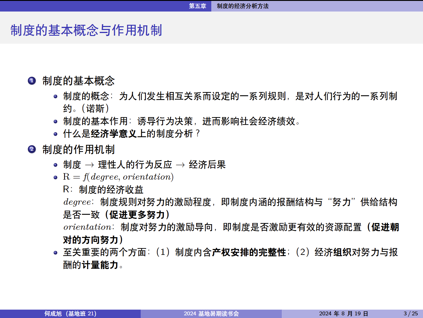 何成旭同学介绍了本书的第五、六两章,深入探讨了中国现行农地制度的合约结构与产权残缺问题,以及土地制度选择与变迁的两大制约因素。第五章通过经济学方法分析了制度对经济行为的影响,指出制度的激励机制和产权安排对农户行为和经济绩效的重要性。作者强调了产权的完整性和经济组织的计量能力在资源配置和利用中的关键作用。第六章则讨论了土地制度选择与变迁面临的两大约束:制度制约和目标制约,指出中国土地制度改革的基本逻辑是在不改变土地公有制的前提下,探索不同的实现形式,以适应经济现代化和国家治理体系现代化的目标。作者还分析了农地、宅基地和农村土地转用制度的现状和问题,提出改革应从改善现行制度安排对农户的约束入手,包括集体所有制改革、两种所有制分治改革、土地治理体系改革,以及改变地方政府在土地出让中的角色。这两章内容为理解中国土地制度的复杂性和改革的必要性提供了深刻的洞见。