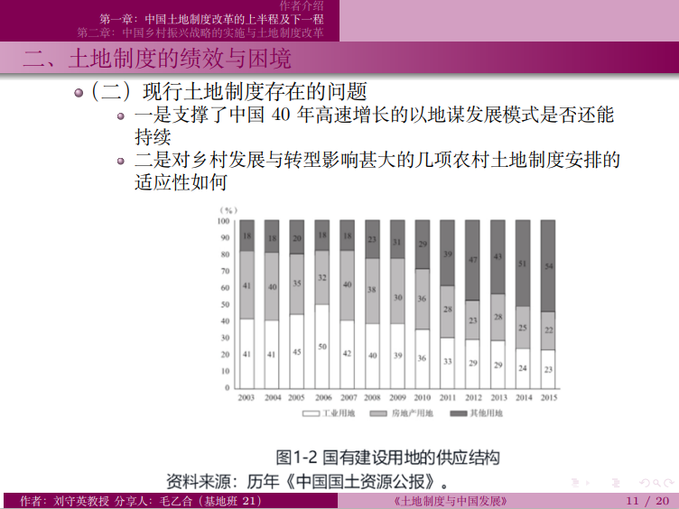 贾文杉同学介绍了本书的第十三章“中国征地制度的历史演变、特征与问题”以及第十四章的“土地制度改革与经济结构转型”。第十三章系统地阐述了中国征地制度自1953年至2018年以来的变迁,这套征地制度为经济社会带来的正反两面的影响,以及征地制度的改革思路。征地制度以低价土地推动快速工业化和城市化,为我国经济发展提供动力;然而由于农地转用的多重管制和城乡分治的所有制,导致土地带来的收益分配不公平,农民被排斥在工业化和城市化之外。由此,书中提出以征地补偿、所有制权利平等和土地财政与经营格局为主的改革思路,旨在维护农民合法权益,维持社会稳定。第十四章探讨了土地制度与经济发展的关系,借助我国土地制度变迁与结构转变的四个阶段的分析,得出深化土地制度改革的需求。我国土地制度从开放土地权利、以地谋发展的工业化,到以地生财和以地融资的城市化,都离不开独特土地制度安排及其变革力量。然而随着这套制度成本上升,国民经济运行风险加大,原有的招商引资、土地抵押融资不再适应经济发展现状。因此指出中国经济需要摆脱发展对土地的依赖,走向转型的道路。