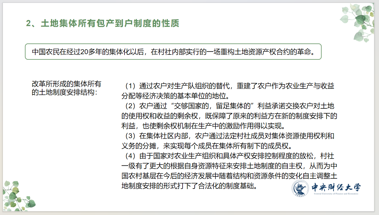 刘先富同学介绍了本书的第七、八两章的主要内容,从中国农村土地集体所有制结构与变迁和中国农地制度的特征与问题两个板块展开了对全书第三部分,即农村土地制度经验研究板块的讲解。第七章从所选取的样本研究区域入手,记录并对比了包产到户实行后一段时间内各主要社会经济特征指标的变化,从而总结出土地集体所有包产到户制度的性质,并对这一制度下农地产权的演进进行了分析:经过20世纪70年代末80年代初的包产到户改革以后,支配中国农村产权制度变迁的力量已发生了重大变化。传统体制下中央政府对土地所有制构造的控制与利益格局的支配,让位于社区结构的影响。中国集体所有制的归宿到底是什么样的,将取决于未来经济和社会结构的变化所引起的农民土地成员权的观念的变化和行动。第八章则更倾向于对有关制度的特征与问题做一个系统而全面的概括,主要有农地承包经营权制度、农村宅基地制度、农村集体建设用地制度等。由制度形成与演进谈起,作者重点分析了这些制度的政策效果,也对政策所面临的困境提出了关注。